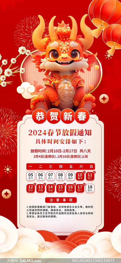 根據(jù)《國務(wù)院辦公廳關(guān)于2024年部分節(jié)假日安排的通知》,2月10日至17日放假調(diào)休,共8天。2月4日(星期日)、2月18日(星期日)上班。鼓勵(lì)各單位結(jié)合帶薪年休假等制度落實(shí),安排除夕正式放假(2月9日)休息。停止發(fā)貨時(shí)間為2月3號(hào)。請各部門做好安全檢查,相關(guān)工作安排和處理。